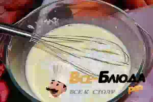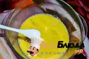 4. Приготовить тесто. Яйца взбить венчиком. В яичную массу положить соль, сметану и майонез. Хорошо перемешать.