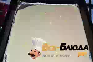 6. Духовку прогреть до 180С. Застелить противень пергаментом или фольгой. Промазать бумагу для выпечки маслом. Влить тесто на противень и выпекать 7-10 минут.