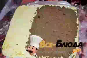 7. Готовую, остывшую основу переложить на ровную поверхность стола. Начинку из печени аккуратно выложить на основу, причем чтобы ничего не распадалось, печень следует примять пальцами рук.