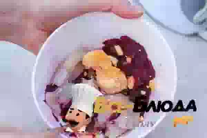 4. Смешать в чаше блендера тертую отжатую свеклу, нарезанное кусочками филе соленой селедки и яичные желтки. Пюрировать до однородности.