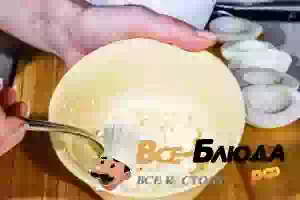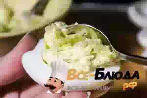 1. яйца сварить вкрутую, переложить в холодную воду, чтобы было легче очистить скорлупу. Очищенные яйца и разрезать вдоль на две равные половинки. Желток вынуть. Чтобы половинки яиц лучше лежали на тарелке, чуть-чуть срежьте округлую часть половинок.