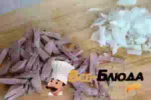 1. Заранее сварить языки. Для этого сначала промыть их под проточной водой, сложить в кастрюлю и залить холодной водой из-под крана. Довести воду до кипения, снимая шумовкой пену, уменьшить огонь, приправить солью, добавить лавровый лист, перец горошком и варить примерно 1-1.5 часа до мягкости языка, т.е. когда вареный язык можно легко проткнуть ножом. Точное время варки языка зависит от его размера. Сваренные языки переложить в холодную воду, дать остыть и, поддевая ножом, снять верхний слой. Очищенный язык нарезать соломкой. Примерно так же порезать лук.