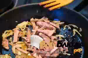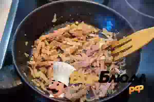 3. Как только лук станет прозрачным и мягким, добавить в сковороду нарезанные языки.