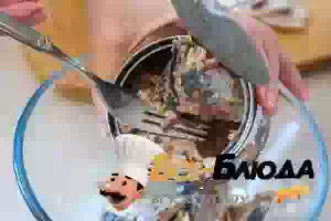 3. С консервированной рыбы слить жидкость. Кусочки рыбы переложить в миску и размять вилкой.