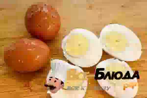 5. Яйца очистить от скорлупы. Каждое яйцо разрезать вдоль на 2 половинки и вынуть желтки.