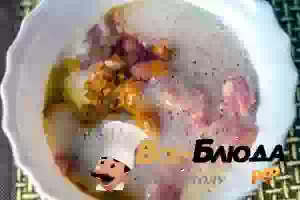 1. Куриное мясо нарезать небольшими кубиками и поместить в миску. Залить мясо молоком, сакэ или белым вином, посыпать порошком карри и влить взбитый белок. Не мешая, отставить миску с курятиной в сторону.