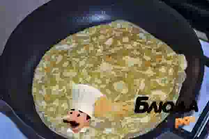 2. На антипригарной сковороде без масла испеките яичные блинчики. Для этого налейте небольшую порцию теста на сковороду и обжарьте нижнюю сторону блина. Затем переверните и доведите блин до готовности.