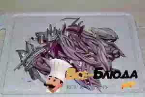 7. Нарежьте перышками очищенный красный лук. Добавьте лук в салатник и перемешайте.