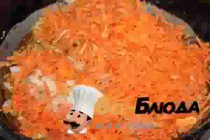 3. Пока запекаются яйца, приготовить начинку: Печень промыть и зачистить от пленок. Нарезать на куски и обжарить минут 5-7 на сильном огне. Главное, не пережарить ее, иначе рулет будет сухой. Печень должна получиться слегка розовой внутри, но без крови. Далее начистить и натереть на крупной терке морковь. Порезать лук перьями. Обжарить их до готовности на растительном масле.