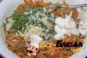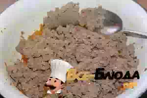 4. Затем переложить получившуюся овощную пассеровку в миску, прибавить измельченную блендером печень и перемешать.