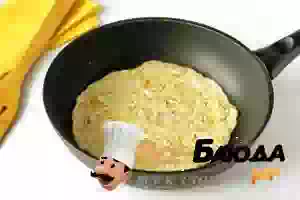 3. Разогрейте сковороду и смажьте ее маслом. Вылейте тонкий слой яичной смеси и на среднем огне сначала обжарьте одну сторону.