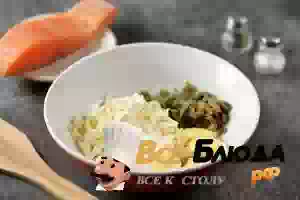2. Разрежьте яйца вдоль на две одинаковые "лодочки". Выскоблите желток в глубокую миску, натрите плавленый сырок на крупной терке, порубите каперсы, добавьте любимый майонез, чуток соли и перца молотого по вкусу.