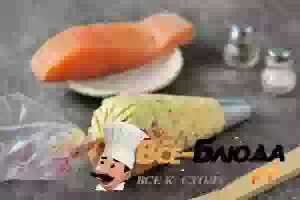 5. Малосольный лосось нарежьте небольшим кубиком, выложите сверху на начинку, украсьте листиком петрушки.