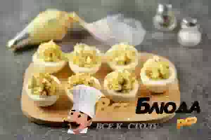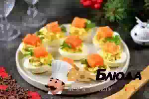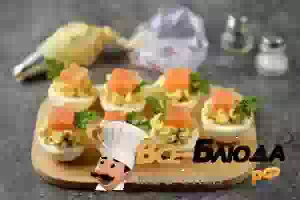 6. Готовые фаршированные яйца с малосольным лососем подавайте к столу сразу же после приготовления.