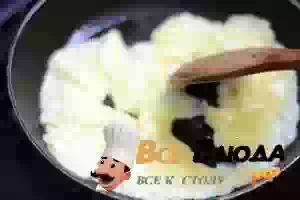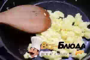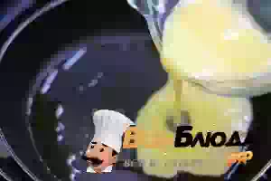 6. Когда яйца немного "схватятся", начинаем их перемешивать деревянной лопаткой.