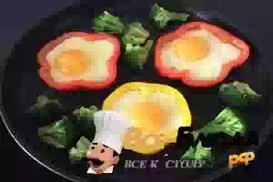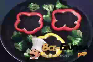 2. На смазанной маслом сковороде слегка поджарить перец с одной стороны. В просветы между кольцами перца выложить брокколи. Вместо брокколи можно использовать и другие овощи или бекон.