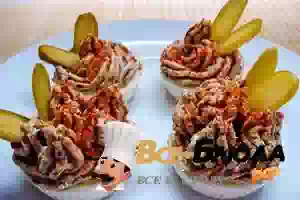 9. Блендером перебить смесь до однородности. Из кондитерского мешка с любой насадкой выдавить на белковую основу начинку. Припылить яйца паприкой. Закуска в виде паровых яиц с начинкой готова. Пара вытянутых кабачковых долек добавит нарядности, а нежный эластичный белок с пикантной начинкой не оставит равнодушных.