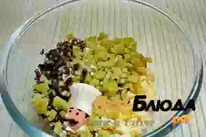 8. Добавить горчицу, перец. Постепенно, чтобы смесь не стала жидкой, добавить майонез. Проверить начинку на соль.