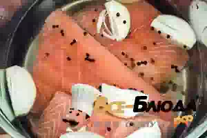 1. Воду посолить, добавить лук, перец, стебли укропа и поставить лосося вариться.