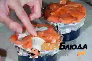 5. Заполнить формочки массой из филе белой рыбы, накрыть сверху свисающими кончиками ломтиков лосося. Сделать из фольги крышки для формочек и разместить их на глубоком противне.