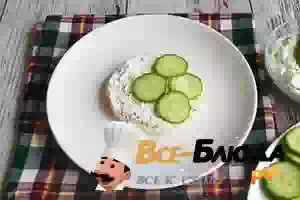 4. На огурец положить следующий круг хлеба и смазать его тонким слоем соуса. Выложить кусочки лосося.