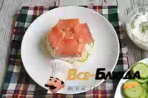 3. Свежий огурец нарезать тонкими кружочками. Филе подкопченного лосося без кож нарезать тонкими ломтиками. На круги из тостового хлеба нанести тонкий слой творожного соуса и распределить по всей поверхности кружочки огурца.