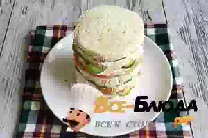5. Снова положить хлеб. Так, намазывая каждый тостовый кружок соусом и чередуя начинку, сложить торт.