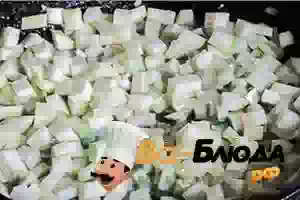 1. Лук чистим, измельчаем ножом, бросаем в разогретое масло. Пока пассеруется лук, нарезаем кубиками молодой кабачок вместе со шкуркой. Добавляем к луку.