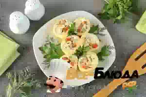 7. Яичный рулет с красной рыбой готов. Нарежьте его на порции и подавайте к столу.