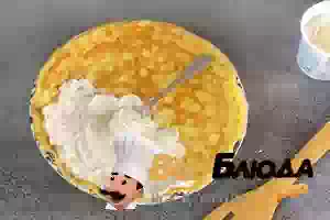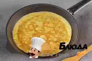 3. Сковороду разогрейте и смажьте маслом. Вылейте яичную смесь и испеките блинчик. Долго обжаривать не нужно, как только схватится, переворачивайте. Размер моей сковороды 26 см. в диаметре, если у вас сковорода меньше, то лучше разделить смесь на два блина.