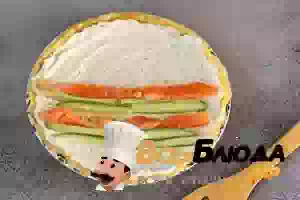 5. Огурец и рыбу нарежьте соломкой и выложите чередуя в два ряда.