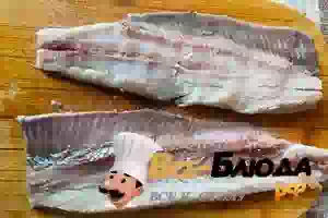 4. Если у вас уже готовое филе, то этот пункт пропускаем. Если же у вас неразделанная селедка, разделываем ее: очищаем, срезаем плавники, отрезаем голову, хвост и аккуратно извлекаем косточки. Разрезаем её на две части. Срезаем с филе неровности, чтобы оно получилось более тонким. Срезанную часть измельчаем.