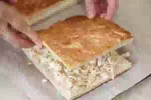 2. Готовый пласт теста разрезать поперек пополам, а затем каждую половину разрезать вдоль, чтобы получилось 4 одинаковых коржа. Обрезать края у каждого прямоугольника.