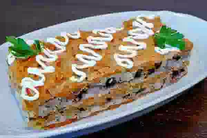 5. Далее повторите слои, слегка уплотняя их ложкой. Последним слоем выложите натертую морковь и залейте рыбный торт яичной смесью (чтобы морковный верхний слой полностью погрузился в заливку) и оставьте на 15 минут для равномерного распределения заливки по всему объему. Отправьте рыбный торт в прогретую до 200 C духовку и запекайте до готовности 1 час. Торт необходимо полностью остудить в форме, после чего поставить в прохладное место, чтобы застыл желатин. Перед подачей рыбного торта уберите пекарскую бумагу, украсьте закуску майонезом и зеленью и нарежьте порционно.