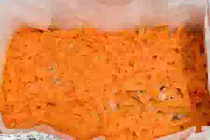 1. Прямоугольную форму застелите пекарской бумагой и смажьте растительным маслом. Яйца слегка размешайте вилкой и соедините c молоком и солью. Очищенную морковь нарежьте тонкими кружочками (отложите 1/3 часть моркови и крупно натрите). Лук порежьте кубиками. На смазанный пергамент внахлест выложите морковные пластины, стараясь полностью закрыть дно.