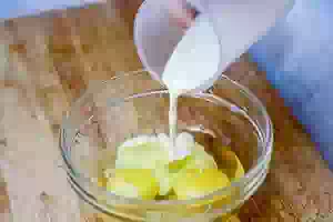 1. В миску, где будете смешивать продукты для омлета, разбить куриные яйца.
