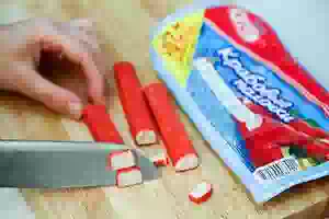 3. Крабовые палочки VIČI нарезать колечками и добавить в яичную смесь.