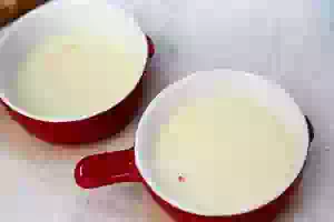 2. Влить молоко, посолить и размешать, не взбивая. Добавить муку и снова размешать, чтобы не осталось комочков.