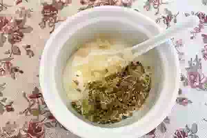 3. Отправить чеснок и лимонную траву в сметану. Перемешать. Оставить салатную заправку при комнатной температуре, чтобы она пропиталась пикантными ароматами, минут на 10.