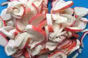 4. Сделать тонкую нарезку из крабовых палочек, а затем потеребить получившиеся кружочки пальцами - получатся колечки разного размера.