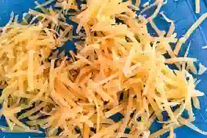 5. Натереть сыр. Если используете сорт канталь, то лучше взять часть бруска, находящуюся ближе к парафину: там этот сыр обычно наиболее твердый, соленый и пряный.