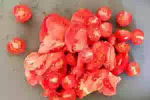 6. Помидоры ошпарить и удалить с больших томатов шкурку, разделить их на дольки, а черри - на половинки.