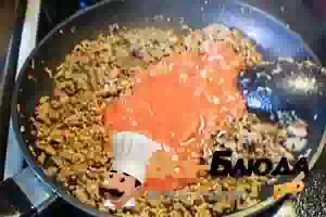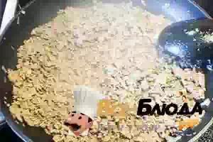 1. Жарим на ложке масла резаный лук вместе с чесноком до прозрачности, добавляем фарш, жарим вместе.