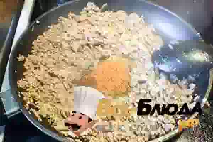 2. Как вся влага выкипит и фарш начнёт поджариваться, всыпать все специи, перемешать.