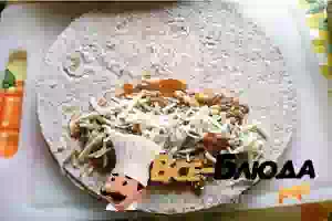 4. Включаем духовку на 200С. Начинаем собирать энчиладос. Начинка, сыр, заворачиваем и складываем.