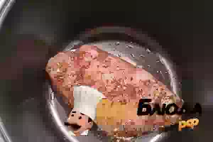 4. Чашу мультиварки смазываем маслом, выкладываем туда филе в специях, на режиме «Выпечка» или «Жарка». Готовим при закрытой крышке 15 минут. Через 15 мин выключаем мультиварку, открываем крышку, переворачиваем филе, закрываем и забываем до утра о нашей индейке.
