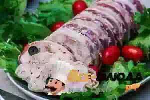 11. Поставить форму с мясом в разогретую до 180С духовку на 1 час. Через час раскрыть края рукава для выпечки и оставить еще примерно на 15-20 минут. Форму с готовым террином вынуть из духовки и дать остыть, не вынимая из формы. Затем положить на террин в форме разделочную доску и поставить небольшой груз. Всю эту конструкцию убрать в холодильник хотя бы на 1 час. Террин переложить на плоское блюдо, аккуратно снять пленку и можно нарезать на кусочки. Праздничный террин из курицы с маслинами готов.