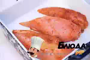 2. Разогреть духовку до 190С и запечь мясо до готовности (около 20 минут). Запеченное филе куриной грудки нарезать тонкими ломтиками.