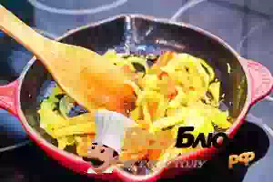 3. Сладкие перцы вымыть, обсушить и нарезать мелкой соломкой. Мелко порезать репчатый лук. Помидоры порезать небольшими дольками. Натереть твердый сыр. В сковороде разогреть растительное масло и добавить лук. Обжаривать, помешивая, до мягкости, а затем положить в сковороду сладкий перец и помидоры. Быстро обжарить, посолить, поперчить и снять сковороду с плиты.