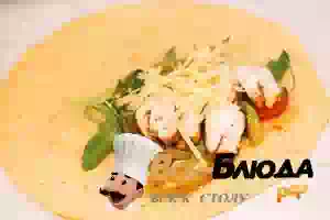 4. На каждую лепешку положить немного обжаренных овощей, ломтики курицы, и свежую зелень. По желанию сбрызнуть соком лайма. Посыпать тертым сыром и вернуть лепешки в трубочку, подгибая края, чтобы не вывалилась начинка.